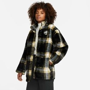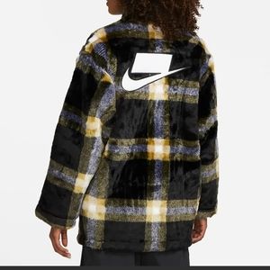 Nike Sportswear Oversize Plaid Faux Fur Jacket Coat Womens Medium DD4541-010.