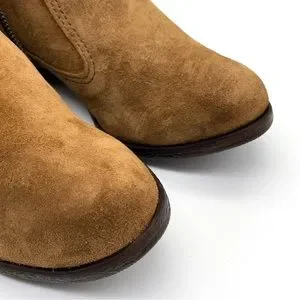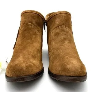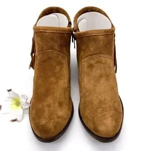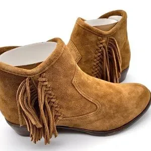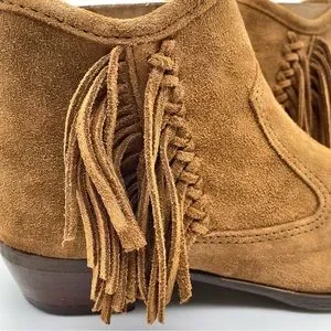 + OTHER DETAILS: Ankle-high suede leather boots in brown. Supple suede upper with fun fringe details for added appeal. Leather western-style heel. Suede upper with bronze hardware accents. Almond toe. Side zip closure. Tonal stitching. Breathable lining. Cushioned footbed for comfort. Durable rubber outsole for traction and flexibility. Approx. 1.5" heel height. Made in Dominican Republic.