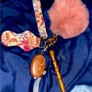 Here you have a pretty beige keychain with a window breaker flashlight alarm and a Pom Pom and lipgloss holder