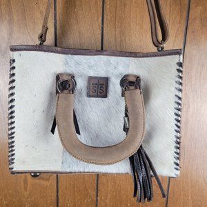 Genuine structured leather and fur fabric lined purse. Zipper and claw hook closures. Interior zipper and two pouch pockets. Compact/sub-compact interior carry holster. Removable shoulder strap. Natural cowhide. Dimensions: 12"(L) x 4 3/4"(W) x 8 1/2"(H).