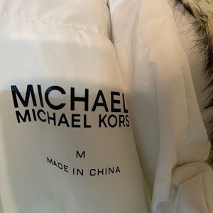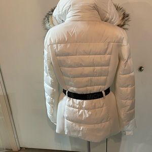 Never worn. Has faux fur hood. Clip belt with MK logo on belt. Puff coat with extended sleeves with thumb cut outs. Snaps & zipper front. Deep pockets. Lined.