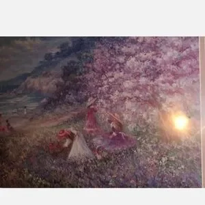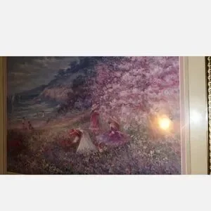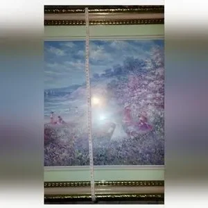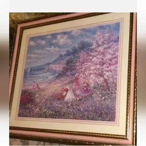 LARGE HOME INTERIOR PICTURE, KIDS AT THE BEACH, PINK & GOLD FRAME. 27.5" X 23.5"