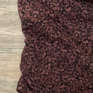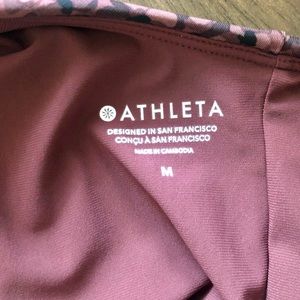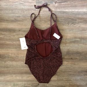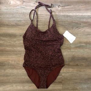 One piece made of recycled swim fabric. Deep red with abstract print design in lighter red and black. Double straps with tie around neck. Large keyhole detail in back. Padded cups, medium seat coverage. Best for A-C cups. NWT Athleta, size medium.