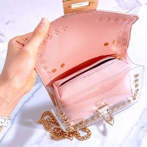 Gold chain, lock, rivet. Crossbody. Handbag. Mini Pouch. Transparent. Studs.