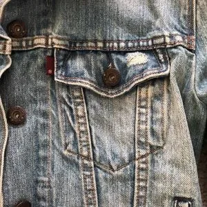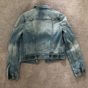 Cute jean jacket in like-new condition. Cute distressing on pocket.