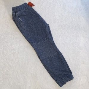 Long sleeve, navy blue & gray tee with wool like pocket plus jogger sweatpants with red drawstring.