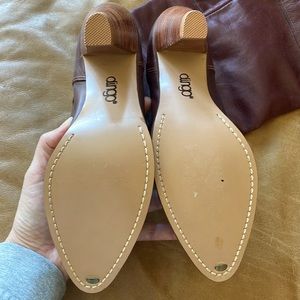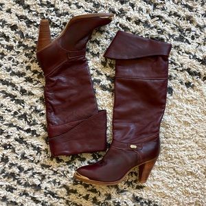 Size 7 women’s boots, mint vintage condition. Burgundy colored leather. 3.5” heel. Never worn, but there is some discoloration inside due to age. Can be worn with top folded down or unfolded. Featuring gold metal logo on the front tip of the toe and also on outside of foot. A true gem!