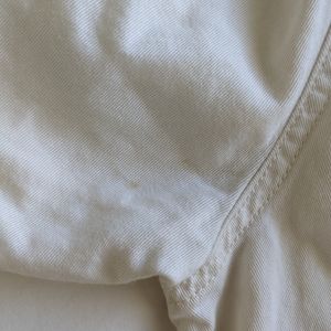 cream has faint spots on the drawstring and right sleeve. not noticeable when worn.
