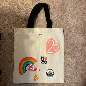 Maje Paris canvas bag The bag measures 16 1/2 inches across and 18 inches long, The black handles measures 9 1/2 inches down & fits on the shoulder nicely! Have a great day!