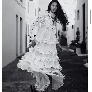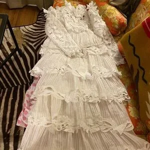 Zimmermann Spring 2021 Collection. Silk linen organza gown featuring a tiered frill skirt with embroidered applique at the hems including butterfly, bumblebee and floral embroidery as well as 3D trim applique at the bodice