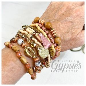 10 Bracelets Total: multi shapes, textures, metals, coin, tassel, and beads, stretch bracelet set.