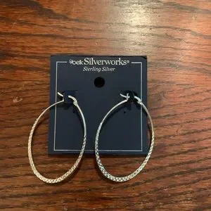 New Sterling Silver Hoop Earrings. Never worn. Lightweight with a beautiful laser cut etching/design.