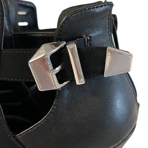 These hot and heavy hybrid shoes have sultry vegan leather in black along the pointed toe and vented upper, paired with a black heel cup with a 3” heel zipper along the back. Ankle cutouts are secured by an black belted accent with adjustable silver buckle. 4" stiletto heel (including tip). Cushioned insole. Rubber sole has nonskid markings. All vegan friendly, man made materials.