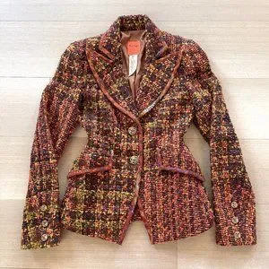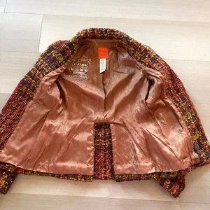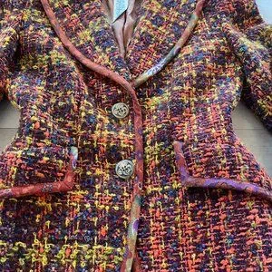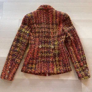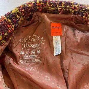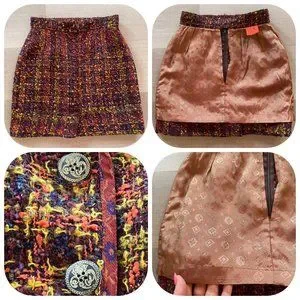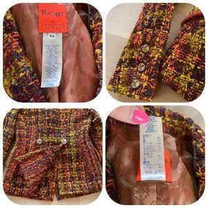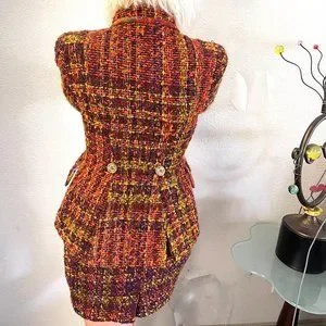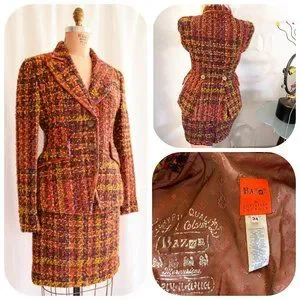 Authentic Made in France Christian Lacroix Bazaar Collection Textured Boucle Wool blend Tweed pencil skirt 2 pisses suit size FR 34, US 2 . Mint condition - worn ones! It has 2 pockets and 2 closing buttons. Jacket -shoulder 14", chest 16", length 24". Skirt - waist 12", length 16" (there is extra 2", you can unfold)