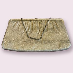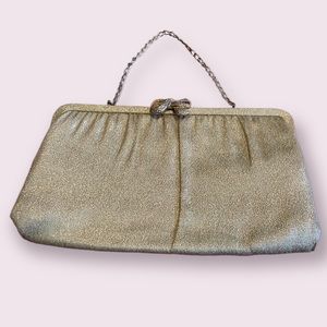 Gold vintage clutch purse. Closure on top is shaped Like a bow. Chain strap for easy carry. Inside is clean and entire bag is in great vintage condition.