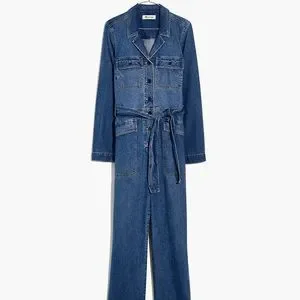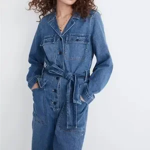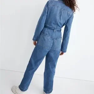 “Made of 100 percent cotton denim with zero stretch, this button-front jumpsuit has a tie waist and flap pockets. Cuff the sleeves and hems to lend it a more laid-back feel. Front rise: 12 7/8"; inseam: 27"; leg opening 17" (based on size M). 100% cotton nonstretch denim. Do Well: We partner with the Better Cotton Initiative to improve cotton farming globally. Machine wash.” // NWT. Never worn. So flattering! I personally prefer the fit of this one over the coveralls.