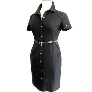 Calvin Klein Short Sleeve Collard Snap From Obsidian Black Shirt Dress Size 12. Classic poly blend woven lined fabric. 38.5” long, 20.5” armpit to armpit, 17.5” waist seam to seam, 22” hips seam to seam, detached belt included, belt is not in perfect condition. Preowned, belt is not original to the dress, no signs of wear, beautiful dress!