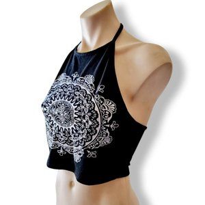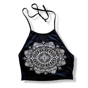 Black halter tie kite crop top with white mandala screen print on front.