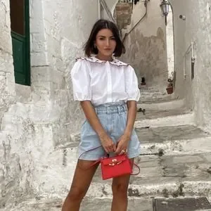 Adorable embroidered collar with short puffed sleeves in 100% cotton poplin blouse.