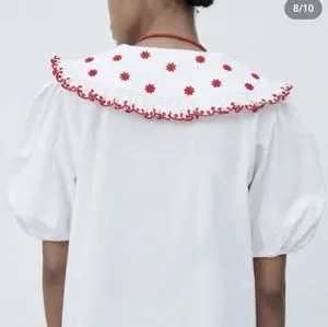 ZARA RED & WHITE EMBROIDERY PETER-PAN COLLAR POPLIN BLOUSE S,M NWT Puff sleeves