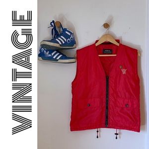 Rare vintage light-weight basketball vest with a front black zipper closure and basketball and hoop embroidery on the front and back in a hot vibrant red that shines. Features front pockets with a flap and snap closure.
