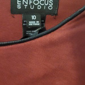 ENFOCUS STUDIOS WOMENS MAROON SHORT SLEEVE DRESS, SOFT VELVETY FEEL, BLACK TRIM ON WASTE AND SLEEVES, NICE DRESS FOR WORK AND PLAY. MAKE IT YOURS TODAY
