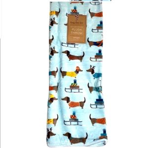 Oversized Dachshund throw blanket featuring a winter themed design on a blue background.