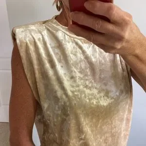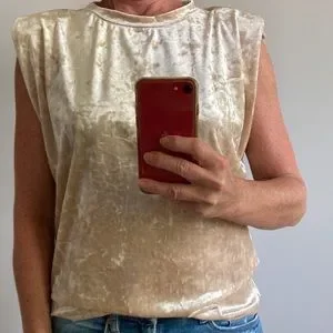 Beige Color Velvet Sleeveless Top. Gorgeous and fun to wear! Can be dressed up or down. Should pads give a square shoulder look. 95 polyester 5 spandex. Laying flat measurements are approx: