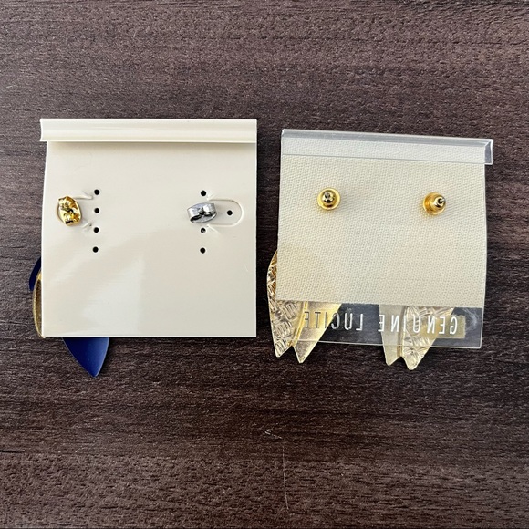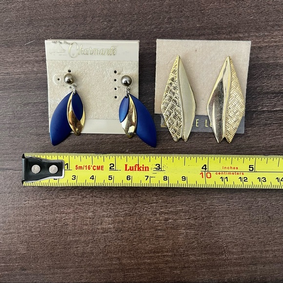 Bundle of 2 vintage pairs of gold jewelry earrings. One are gold colored and the others are navy blue and gold colored. Not real gold & don't know the real material. Check pictures for the sizing. Great vintage condition and gently used. Don't expect vintage and used items to look like new.