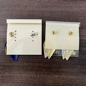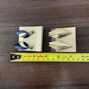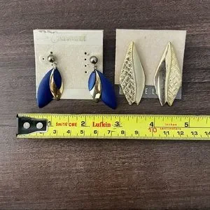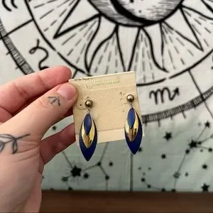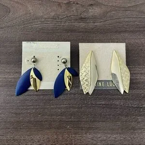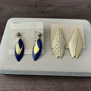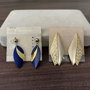 Bundle of 2 vintage pairs of gold jewelry earrings. One are gold colored and the others are navy blue and gold colored.