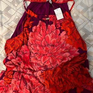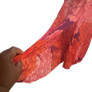 East 1946, floral dress embellished with a gold tone hardware on front collar•colors in dress are orange, pink, purple with purple lining. New with tag