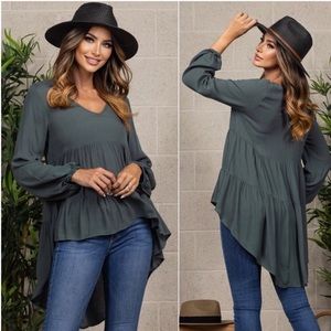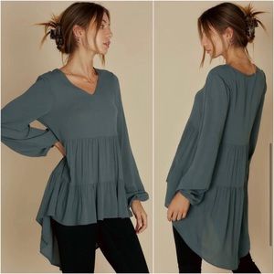 Details - scoop neckline, long bishop style sleeves, babydoll style, tiered ruffles, shirt tail hi low design, lightweight and flowy, dusty teal green color, unlined