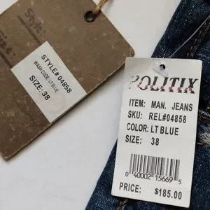 New with tags from Politix. Amazing new condition with a lot of distressing, on all pockets and all over the jean.