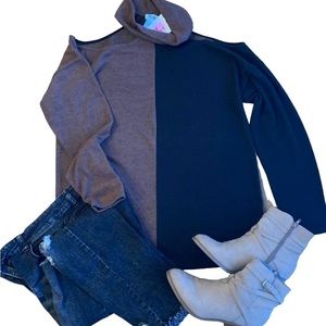 Bibi cold shoulder 1/2 brown 1/2 black front brown sweater. nwt size L