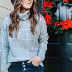 Grey Grid Printed Long Sweater Plaid Pattern Split Sides Pullover Turtleneck