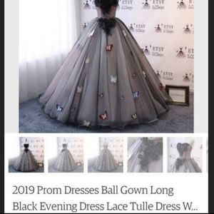 Beautiful black evening dress with lace and tulle and butterflies on it.