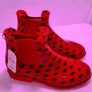 whimsical rain boots red with black polka dots