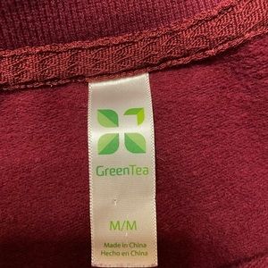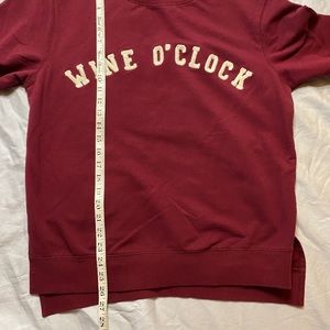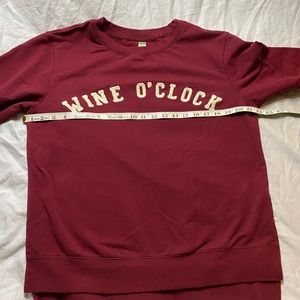 Size Medium Green Tea wine o’ clock crew neck sweater. Is a little longer on the back side. The letters are embroidered. Very cute, comfy and cozy. Fits up to a 44” chest, 26” long