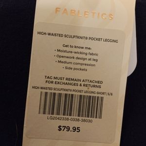 New With Tags Fabletics High Waisted Sculptknit Pocket Leggings Moisture Wicking Fabric Openwork design at leg Medium Compression Side Pockets Size Small Measurements Approx: Waist 17 Inches Waist to Bottom Hem 32 Inches Inseam 24 Inches 90% Nylon 10% Elastane Machine Washable