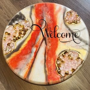 this is a hand made geode inspired sign made on a heavy duty wood piece. The 2nd picture is just a sample it does not have the word welcome on it but I can put it on there or a custom saying. I could also make it into a serving tray as shown. this is a 12 inch board. if you want a custom saying on it, please allow at least 24 hrs for me to put it on and put a top coat over it to cure.