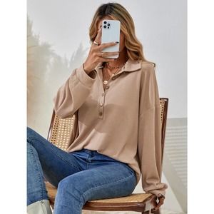 🌟 fold down collared Half Button henley long sleeve soft knit tee fall tan
