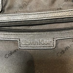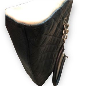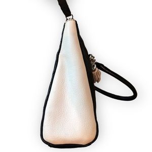 Calvin Klein black leather quilted tote with white sides and white leather tassel. Handles have silver tone chains.
