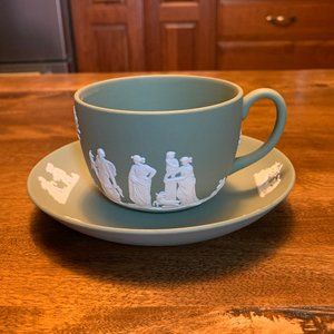 Vintage Wedgwood Sage Green Jasperware Teacup and Saucer Set. Decorated in white relief with Grecian figures around the outside of the cup and around the inside rim of the saucer.
