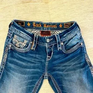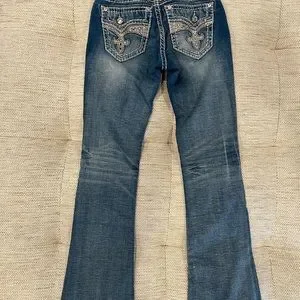 Rock revival boot cut size 24 style ‘Yui’ low rise~~ this is not a duplicate listing I have two pairs of these… Length 32 ~ This pair is a bit darker in color and you can see in the picture that the back bottoms of the legs are both worn a tiny bit~