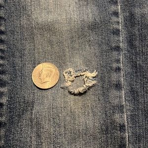 Gently loved jeans. Very comfortable and cute fitting. Has a small hole on left knee shown in picture. You could patch it or add a few more for a unique style you created.