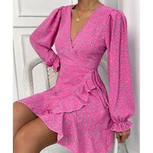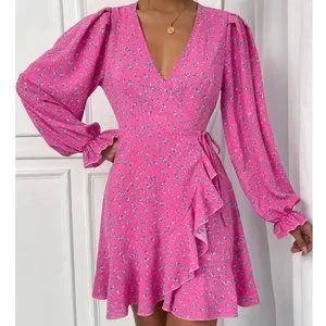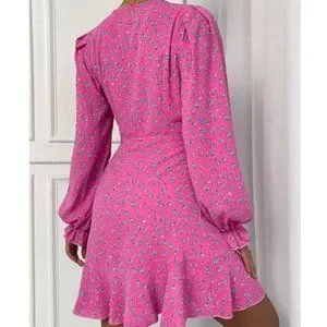 Pink Boho Ditsy Floral Flounce Long Sleeve Knot Side Mini Dress