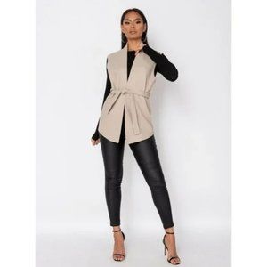 Beige Wool Blend Sleeveless Belted Vest Blazer Jacket