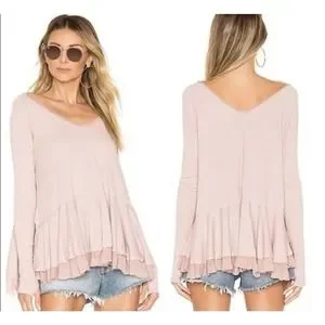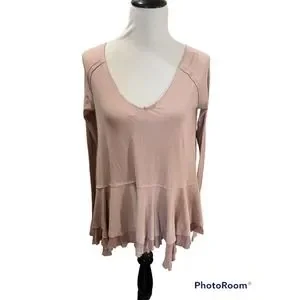 Free People We The Free •XS• Tangerine Thumbhole Flared Hem Distressed Pink Top.