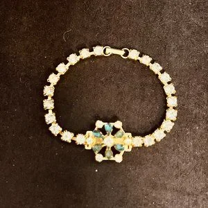 Vintage Gold Tone Blue And Clear Rhinestone Floral Tennis Bracelet (3800)