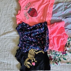 Girl's mix and match bundle. Berry sweet and dinosaur shirts are Carter's. Berry sweet is 9m, dinosaur is 6m. Cherry shirt is OshKosh 6m. Pink shorts are Carter's 6m. Flamingo pants are 9m, Carter's. Floral ruffle butt pants are Old Navy 6-12m.